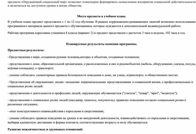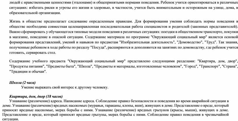 Обучение детей жизни в обществе включает формирование представлений об окружающем социальном мире и умений ориентироваться в нем, включаться в социальные отношения. В силу различных особенностей физического, интеллектуального, эмоционального развития дети с ТМНР испытывают трудности в осознании социальных явлений. В связи с этим программа учебного предмета «Окружающий социальный мир» позволяет планомерно формировать осмысленное восприятие социальной действительности и включаться на доступном уровне в жизнь общества.