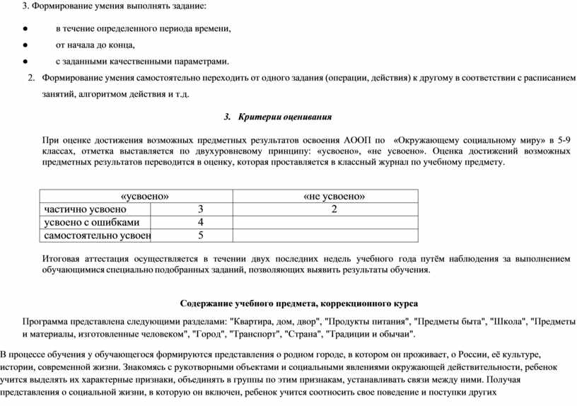 При оценке достижения возможных предметных результатов освоения АООП по «Окружающему социальному миру» в 5-9 классах, отметка выставляется по двухуровневому принципу: «усвоено», «не усвоено». Оценка достижений возможных предметных результатов переводится в оценку, которая проставляется в классный журнал по учебному предмету.