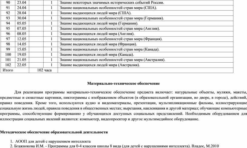 Для реализации программы материально-техническое обеспечение предмета включает: натуральные объекты, муляжи, макеты, предметные и сюжетные картинки, пиктограммы с изображением объектов (в образовательной организации, во дворе, в городе), действий, правил поведения. Кроме того, используются аудио и видеоматериалы, презентации, мультипликационные фильмы, иллюстрирующие социальную жизнь людей, правила поведения в общественных местах; вырезания, наклеивания и другой материал; обучающие компьютерные программы, способствующие формированию у обучающихся доступных социальных представлений. Необходимым оборудованием для иллюстрации социальных явлений являются: компьютер, видеопроектор и другое мультимедийное оборудование.