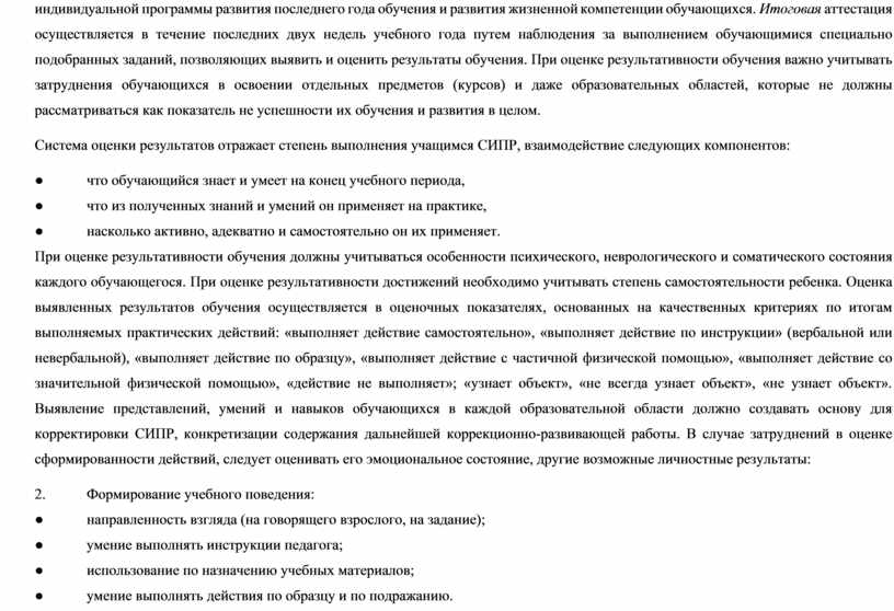 При оценке результативности обучения должны учитываться особенности психического, неврологического и соматического состояния каждого обучающегося. При оценке результативности достижений необходимо учитывать степень самостоятельности ребенка. Оценка выявленных результатов обучения осуществляется в оценочных показателях, основанных на качественных критериях по итогам выполняемых практических действий: «выполняет действие самостоятельно», «выполняет действие по инструкции» (вербальной или невербальной), «выполняет действие по образцу», «выполняет действие с частичной физической помощью», «выполняет действие со значительной физической помощью», «действие не выполняет»; «узнает объект», «не всегда узнает объект», «не узнает объект». Выявление представлений, умений и навыков обучающихся в каждой образовательной области должно создавать основу для корректировки СИПР, конкретизации содержания дальнейшей коррекционно-развивающей работы. В случае затруднений в оценке сформированности действий, следует оценивать его эмоциональное состояние, другие возможные личностные результаты: