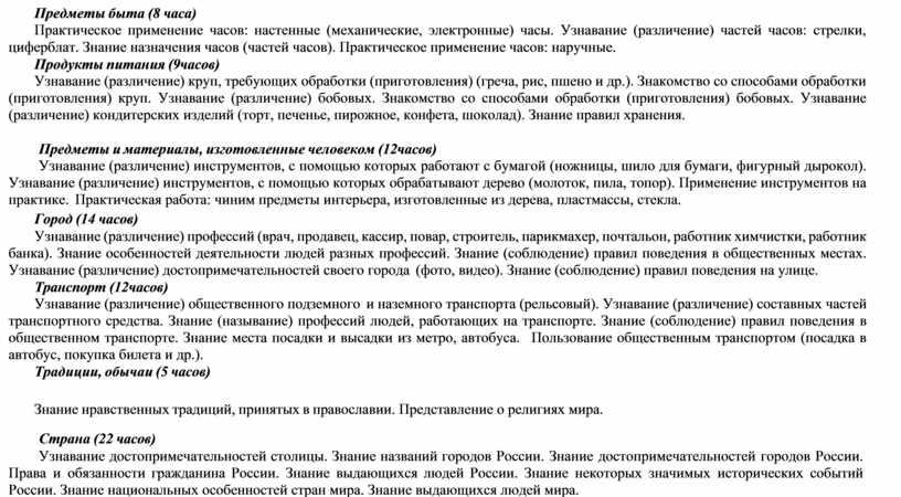 Программа представлена следующими разделами: "Квартира, дом, двор", "Продукты питания", "Предметы быта", "Школа", "Предметы и материалы, изготовленные человеком", "Город", "Транспорт", "Страна", "Традиции и обычаи".