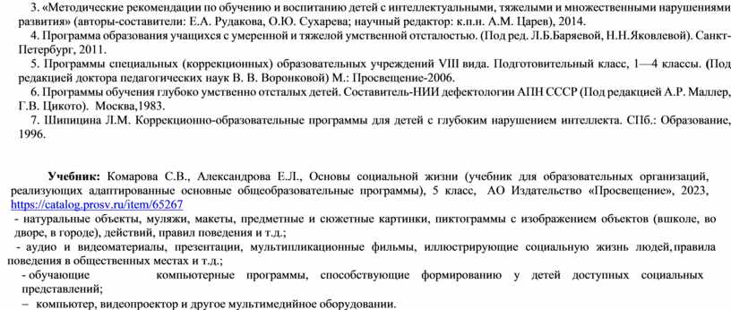 Учебник: Комарова С.В., Александрова Е.Л., Основы социальной жизни (учебник для образовательных организаций, реализующих адаптированные основные общеобразовательные программы), 5 класс, АО Издательство «Просвещение», 2023, https://catalog.prosv.ru/item/65267