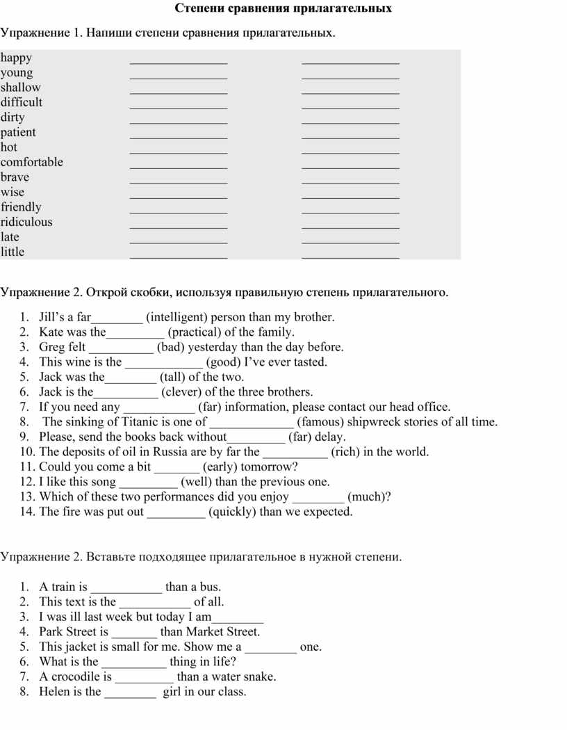 Упражнение 2. Вставьте подходящее прилагательное в нужной степени.