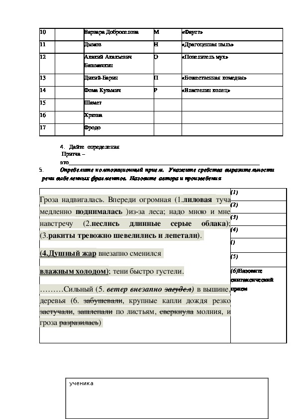 Административная работа предназначена для проверки знаний по литературе за второе полугодие по программе Б.А.Ланина.Гроза надвигалась. Впереди огромная (1.лиловая туча медленно поднималась )из-за леса; надо мною и мне навстречу (2.неслись длинные серые облака); (3.ракиты тревожно шевелились и лепетали). (4.Душный жар внезапно сменился влажным холодом); тени быстро густели. ………Сильный (5. ветер внезапно загудел) в вышине, деревья (6. забушевали, крупные капли дождя резко застучали, зашлепали по листьям, сверкнула молния, и гроза разразилась)конспект