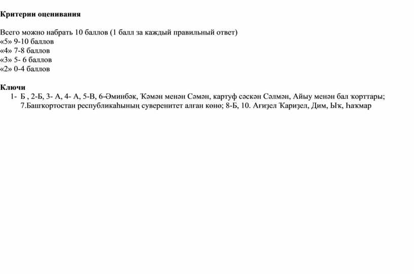 1- Б , 2-Б, 3- А, 4- А, 5-В, 6-Әминбәк, Ҡәмән менән Сәмән, картуф сәскән Сәлмән, Айыу менән бал ҡорттары; 7.Башҡортостан республикаһының суверенитет алған көнө; 8-Б, 10. Ағиҙел Ҡариҙел, Дим, Ыҡ, Һаҡмар