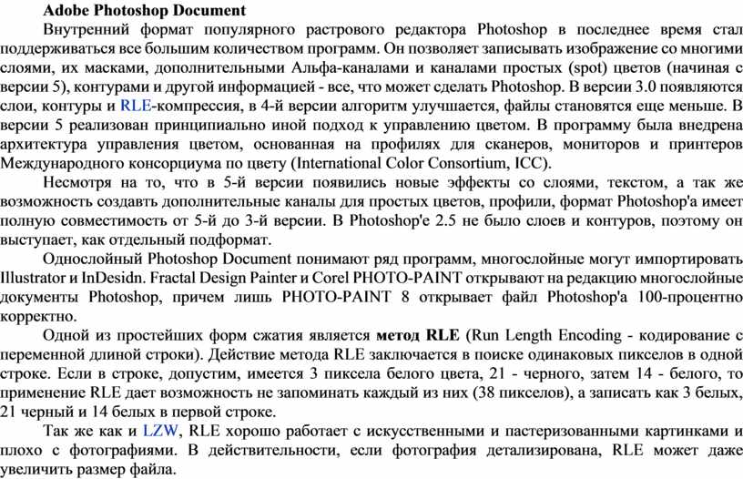 Внутренний формат популярного растрового редактора Photoshop в последнее время стал поддерживаться все большим количеством программ. Он позволяет записывать изображение со многими слоями, их масками, дополнительными Альфа-каналами и каналами простых (spot) цветов (начиная с версии 5), контурами и другой информацией - все, что может сделать Photoshop. В версии 3.0 появляются слои, контуры и RLE-компрессия, в 4-й версии алгоритм улучшается, файлы становятся еще меньше. В версии 5 реализован принципиально иной подход к управлению цветом. В программу была внедрена архитектура управления цветом, основанная на профилях для сканеров, мониторов и принтеров Международного консорциума по цвету (International Color Consortium, ICC).