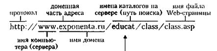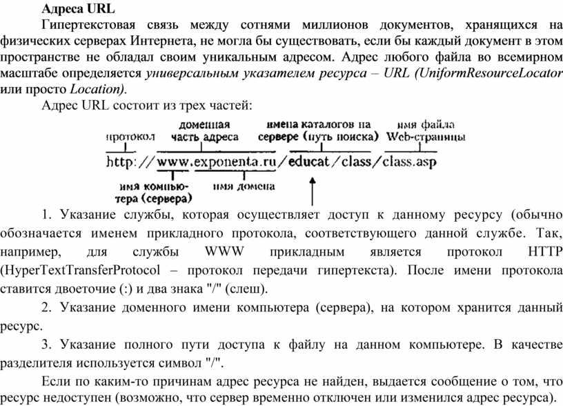 Гипертекстовая связь между сотнями миллионов документов, хранящихся на физических серверах Интернета, не могла бы существовать, если бы каждый документ в этом пространстве не обладал своим уникальным адресом. Адрес любого файла во всемирном масштабе определяется универсальным указателем ресурса – URL (UniformResourceLocator или просто Location).