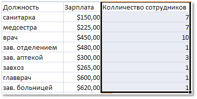 1.5. В столбце E укажите количество сотрудников каждой должности.