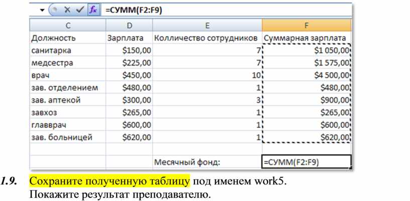 1.8. В ячейке F11 вычислите месячный фонд, просуммировав функцией СУММ все значения столбца F: