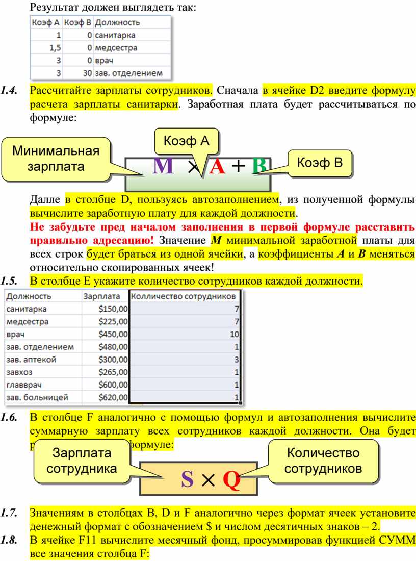 1.6. В столбце F аналогично с помощью формул и автозаполнения вычислите суммарную зарплату всех сотрудников каждой должности. Она будет рассчитываться по формуле: