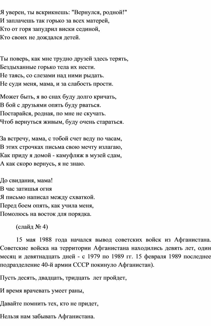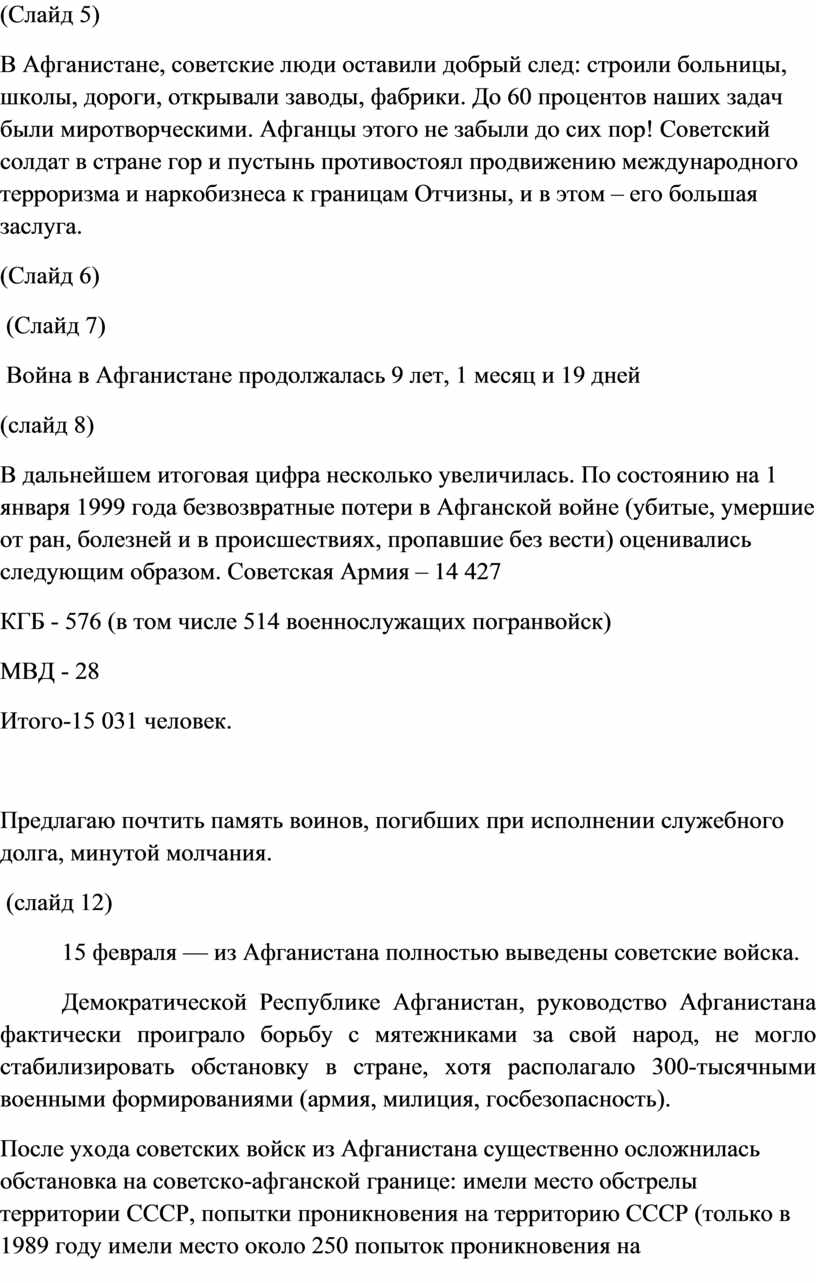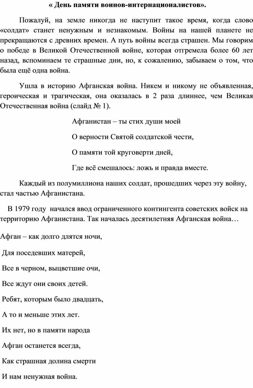 Ушла в историю Афганская война. Никем и никому не объявленная, героическая и трагическая, она оказалась в 2 раза длиннее, чем Великая Отечественная война (слайд № 1).