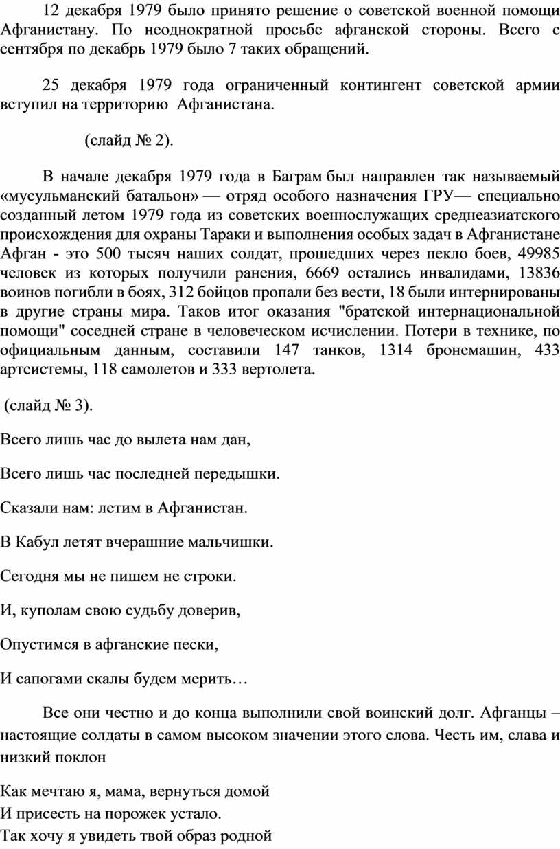 12 декабря 1979 было принято решение о советской военной помощи Афганистану. По неоднократной просьбе афганской стороны. Всего с сентября по декабрь 1979 было 7 таких обращений.