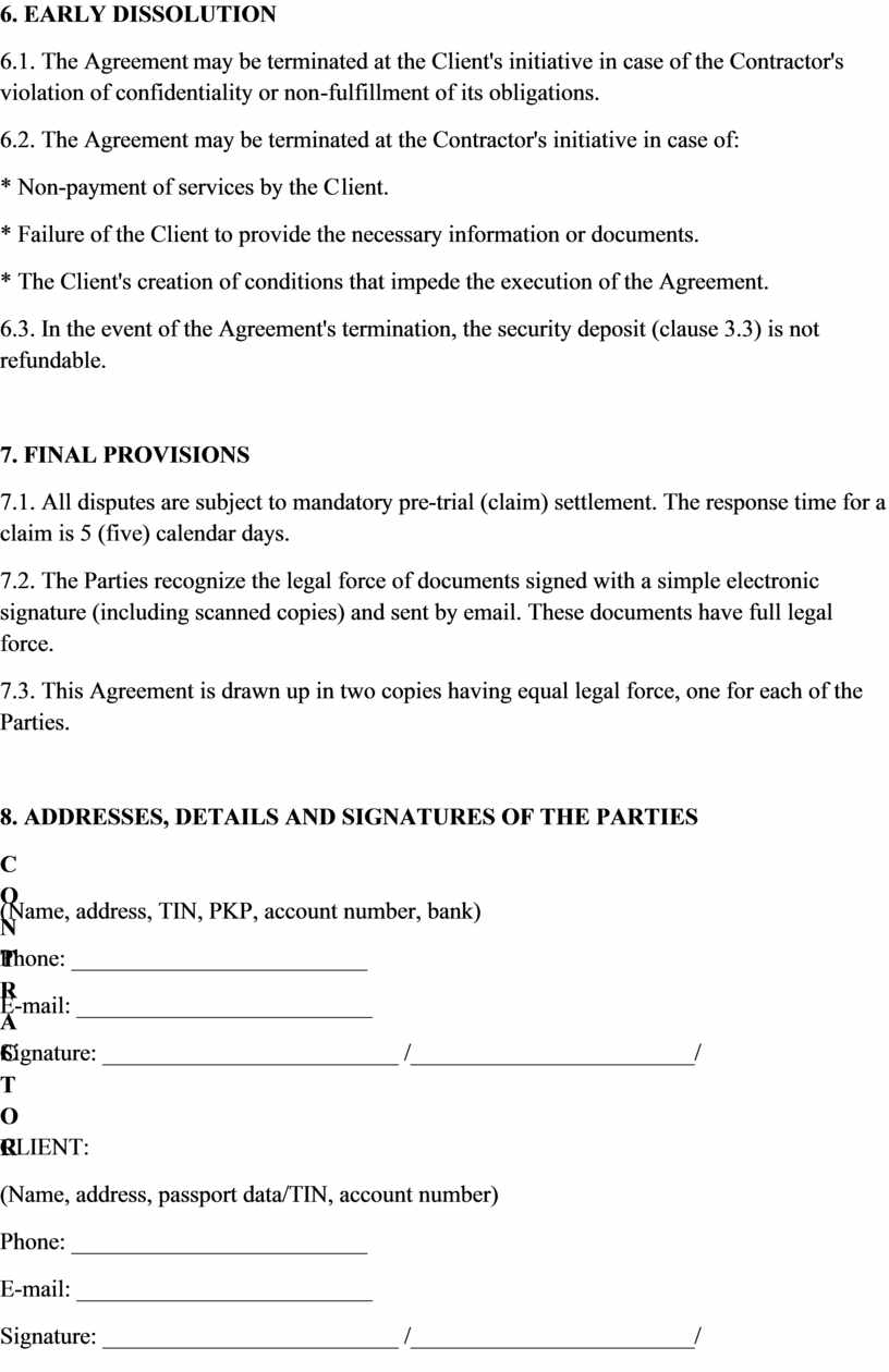6.1. The Agreement may be terminated at the Client's initiative in case of the Contractor's violation of confidentiality or non-fulfillment of its obligations.