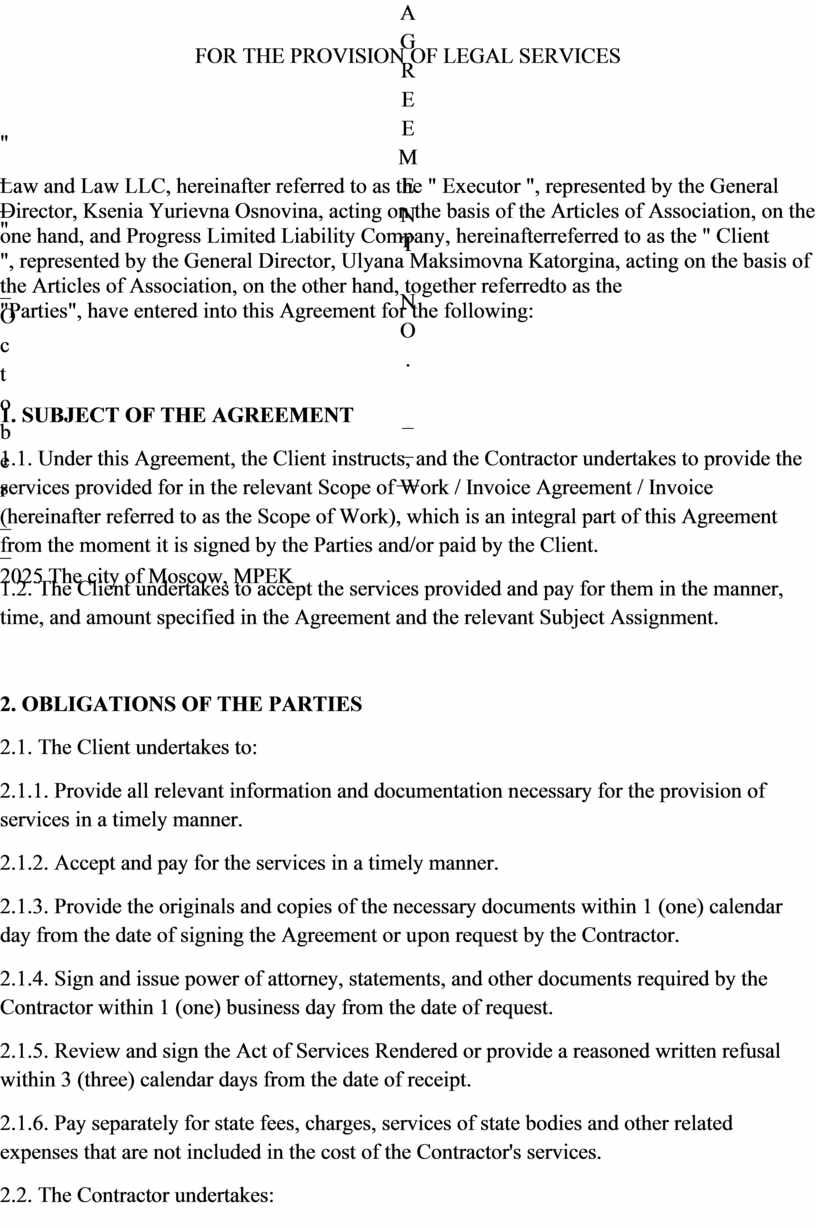 Law and Law LLC, hereinafter referred to as the " Executor ", represented by the General Director, Ksenia Yurievna Osnovina, acting on the basis of the Articles of Association, on the one hand, and Progress Limited Liability Company, hereinafterreferred to as the " Client ", represented by the General Director, Ulyana Maksimovna Katorgina, acting on the basis of the Articles of Association, on the other hand, together referredto as the "Parties", have entered into this Agreement for the following:
