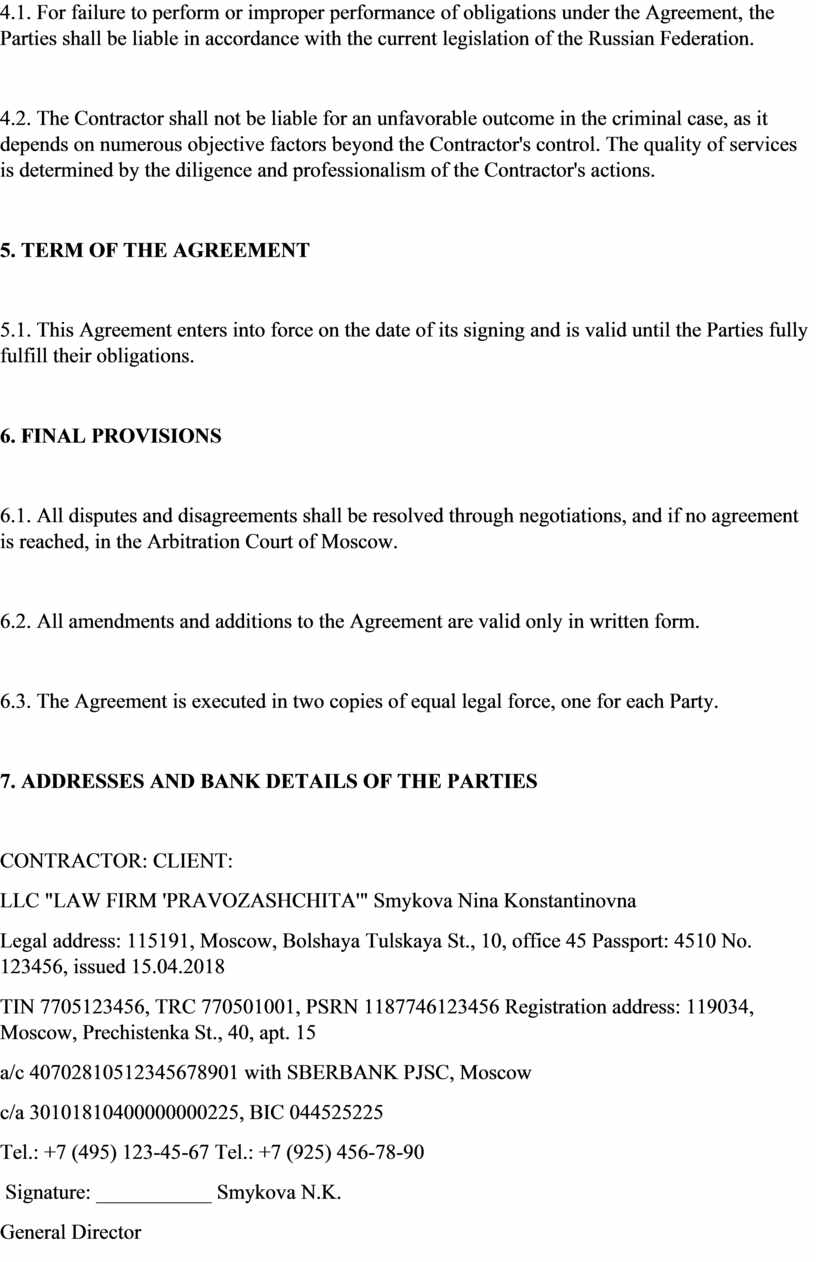 4.2. The Contractor shall not be liable for an unfavorable outcome in the criminal case, as it depends on numerous objective factors beyond the Contractor's control. The quality of services is determined by the diligence and professionalism of the Contractor's actions.