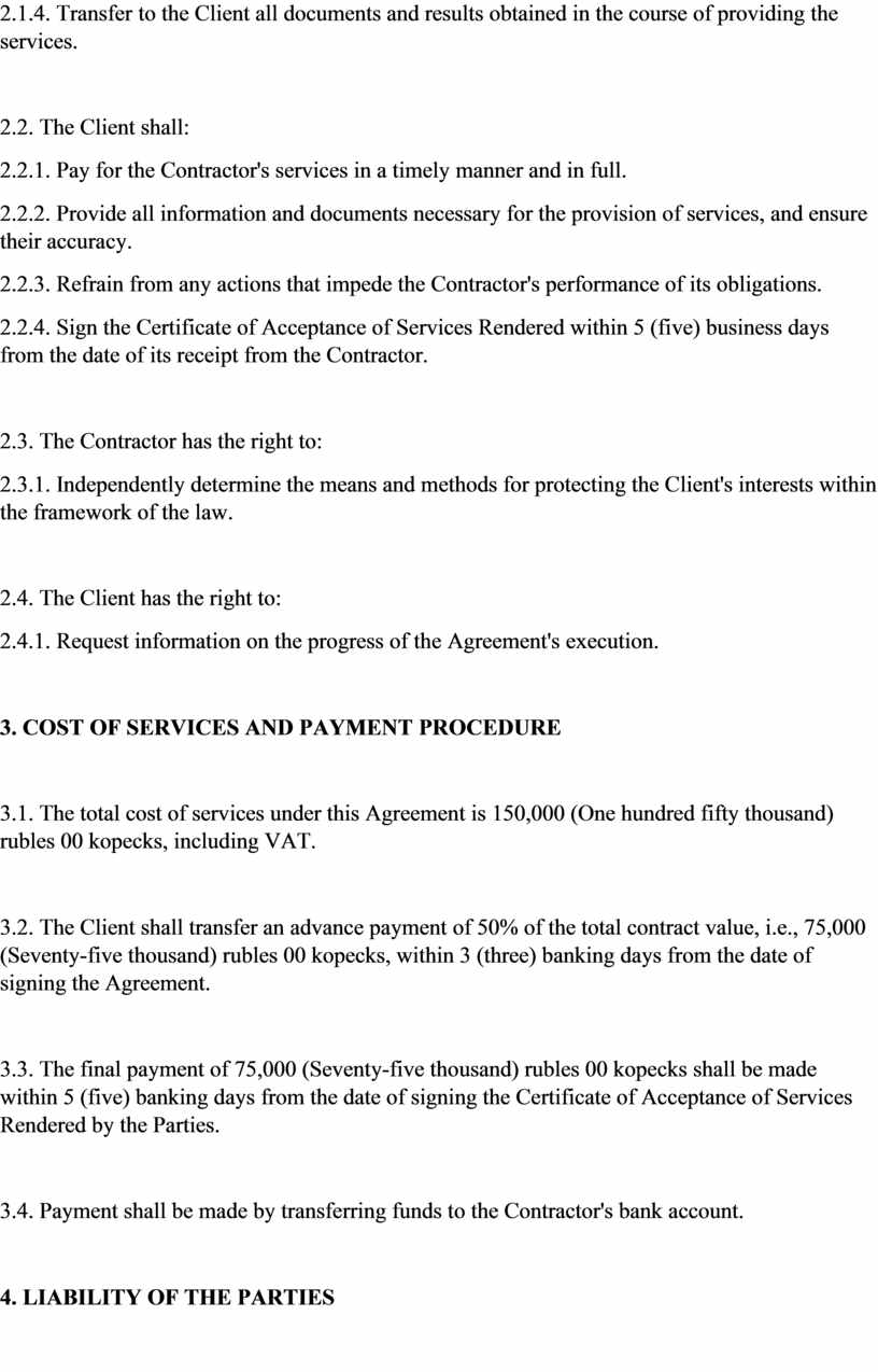 3.3. The final payment of 75,000 (Seventy-five thousand) rubles 00 kopecks shall be made within 5 (five) banking days from the date of signing the Certificate of Acceptance of Services Rendered by the Parties.