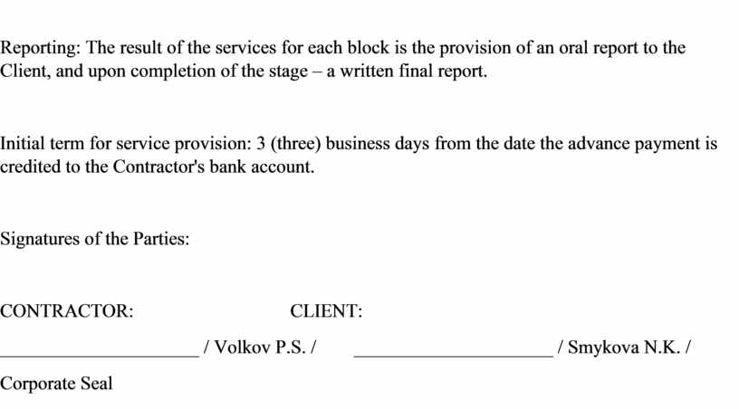 Reporting: The result of the services for each block is the provision of an oral report to the Client, and upon completion of the stage – a written final report.