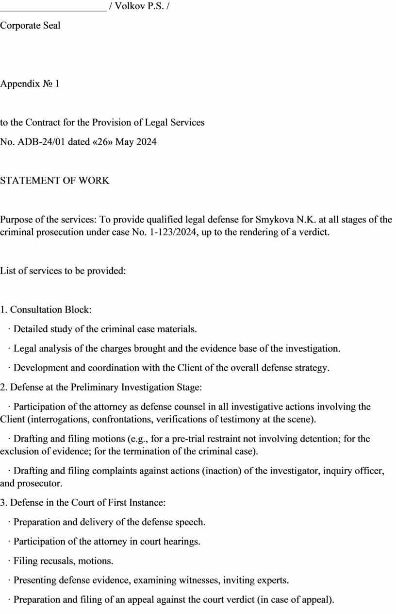 Purpose of the services: To provide qualified legal defense for Smykova N.K. at all stages of the criminal prosecution under case No. 1-123/2024, up to the rendering of a verdict.