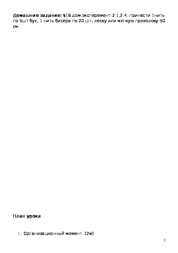 Оборудование:Домашние задание: §16 дом.эксперемент 2.1,2.4. принести 1нить