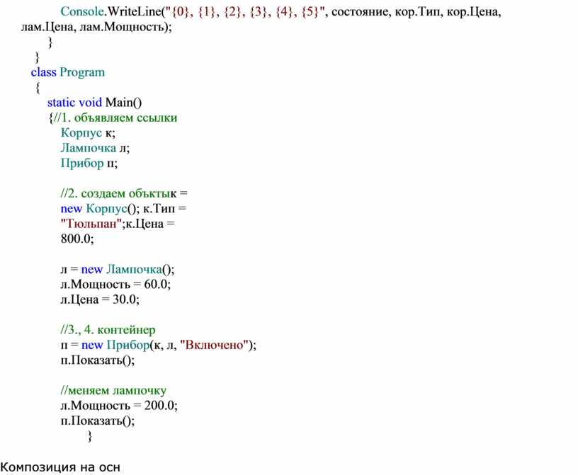Console.WriteLine("{0} {1} {2} {3} {4} {5}", состояние, кор.Тип, кор.Цена, лам.Цена, лам.Мощность);