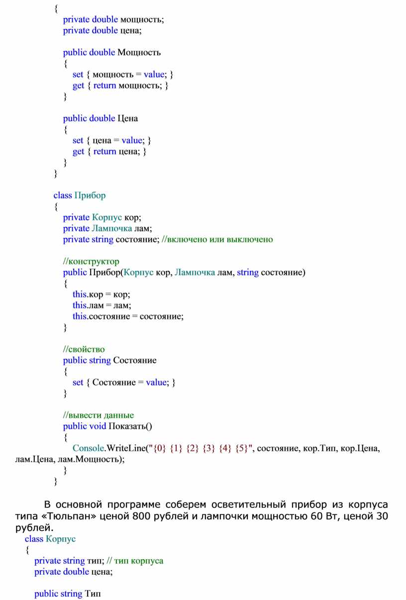 л = new Лампочка(); л.Мощность = 60.0;