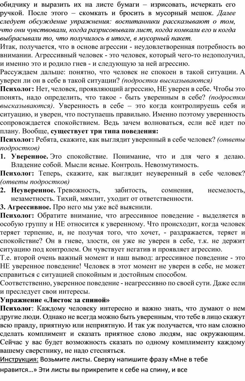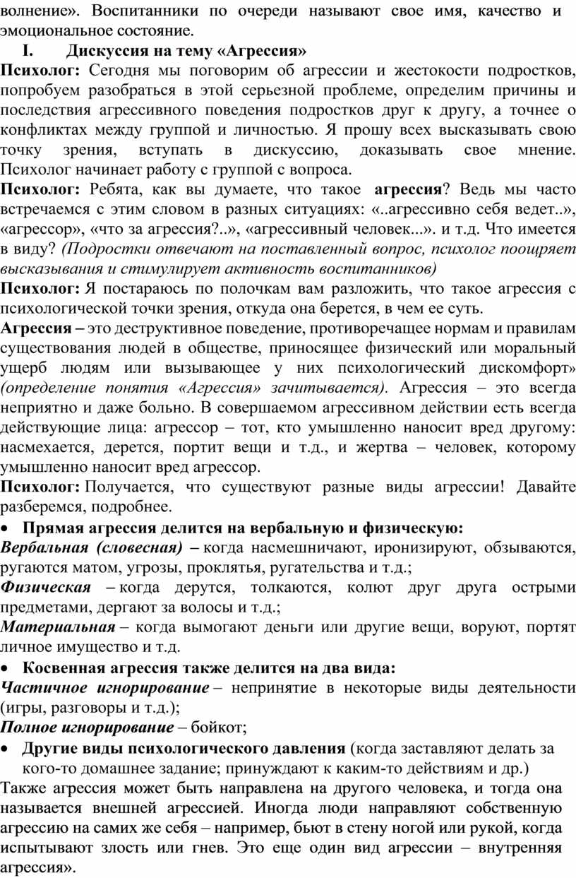 Психолог: Сегодня мы поговорим об агрессии и жестокости подростков, попробуем разобраться в этой серьезной проблеме, определим причины и последствия агрессивного поведения подростков друг к другу, а точнее о конфликтах между группой и личностью. Я прошу всех высказывать свою точку зрения, вступать в дискуссию, доказывать свое мнение. Психолог начинает работу с группой с вопроса.