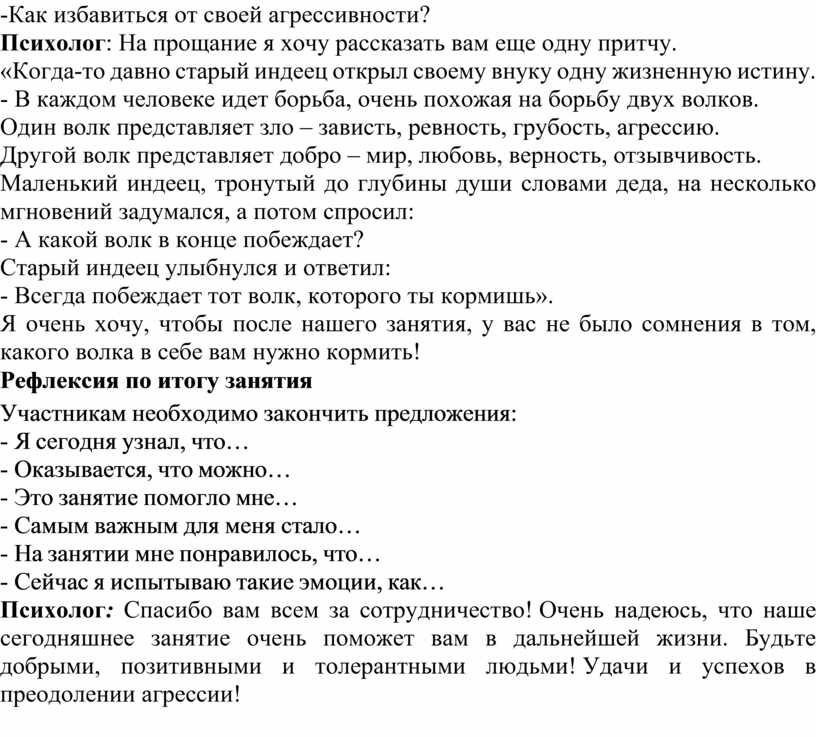 Психолог: Спасибо вам всем за сотрудничество! Очень надеюсь, что наше сегодняшнее занятие очень поможет вам в дальнейшей жизни. Будьте добрыми, позитивными и толерантными людьми! Удачи и успехов в преодолении агрессии!