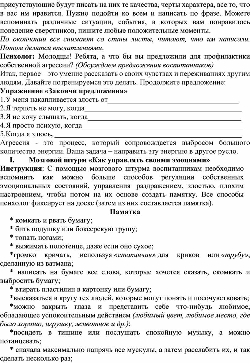 Инструкция: С помощью мозгового штурма воспитанникам необходимо вспомнить как можно больше способов регуляции собственных эмоциональных состояний, управления раздражением, злостью, плохим настроением, чтобы потом на их основе создать памятку. Все способы психолог фиксирует на доске (затем из них составляется памятка).