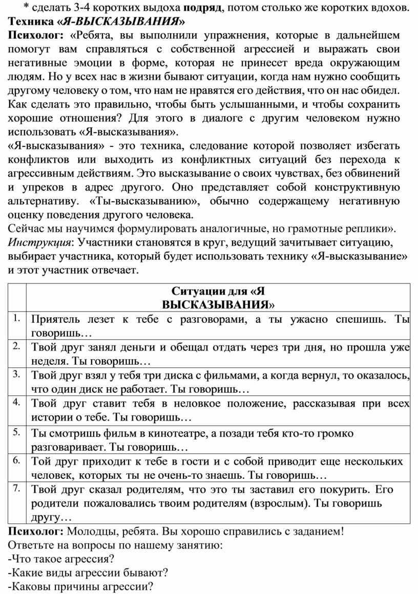 Психолог: «Ребята, вы выполнили упражнения, которые в дальнейшем помогут вам справляться с собственной агрессией и выражать свои негативные эмоции в форме, которая не принесет вреда окружающим людям. Но у всех нас в жизни бывают ситуации, когда нам нужно сообщить другому человеку о том, что нам не нравятся его действия, что он нас обидел. Как сделать это правильно, чтобы быть услышанными, и чтобы сохранить хорошие отношения? Для этого в диалоге с другим человеком нужно использовать «Я-высказывания».