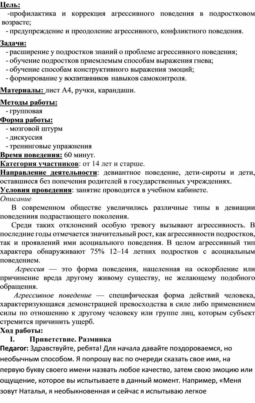 Цель: обучение безопасным способам выражения агрессии.