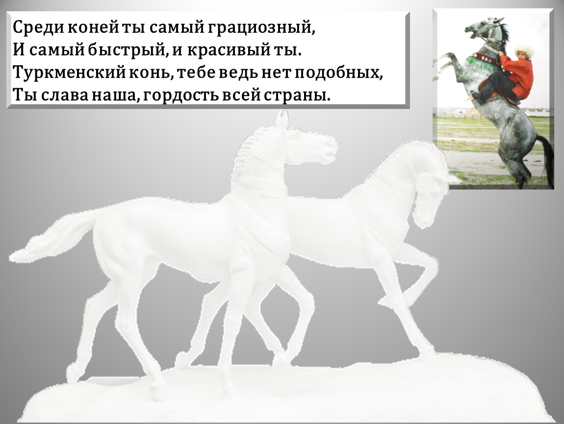 И самый быстрый, и красивый ты. Туркменский конь, тебе ведь нет подобных, Ты слава наша, гордость всей страны.