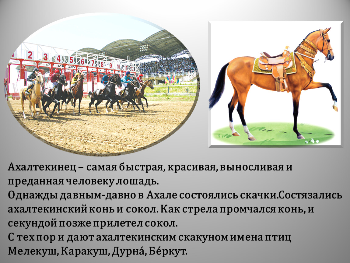 Однажды давным-давно в Ахале состоялись скачки.Состязались ахалтекинский конь и сокол. Как стрела промчался конь, и секундой позже прилетел сокол.