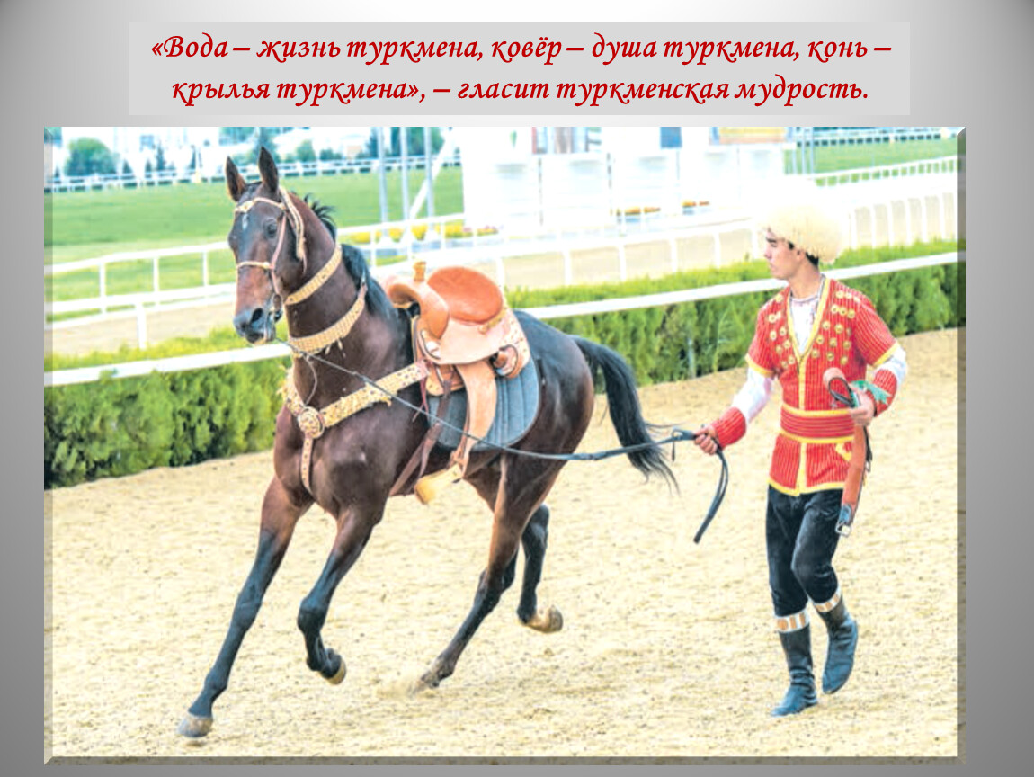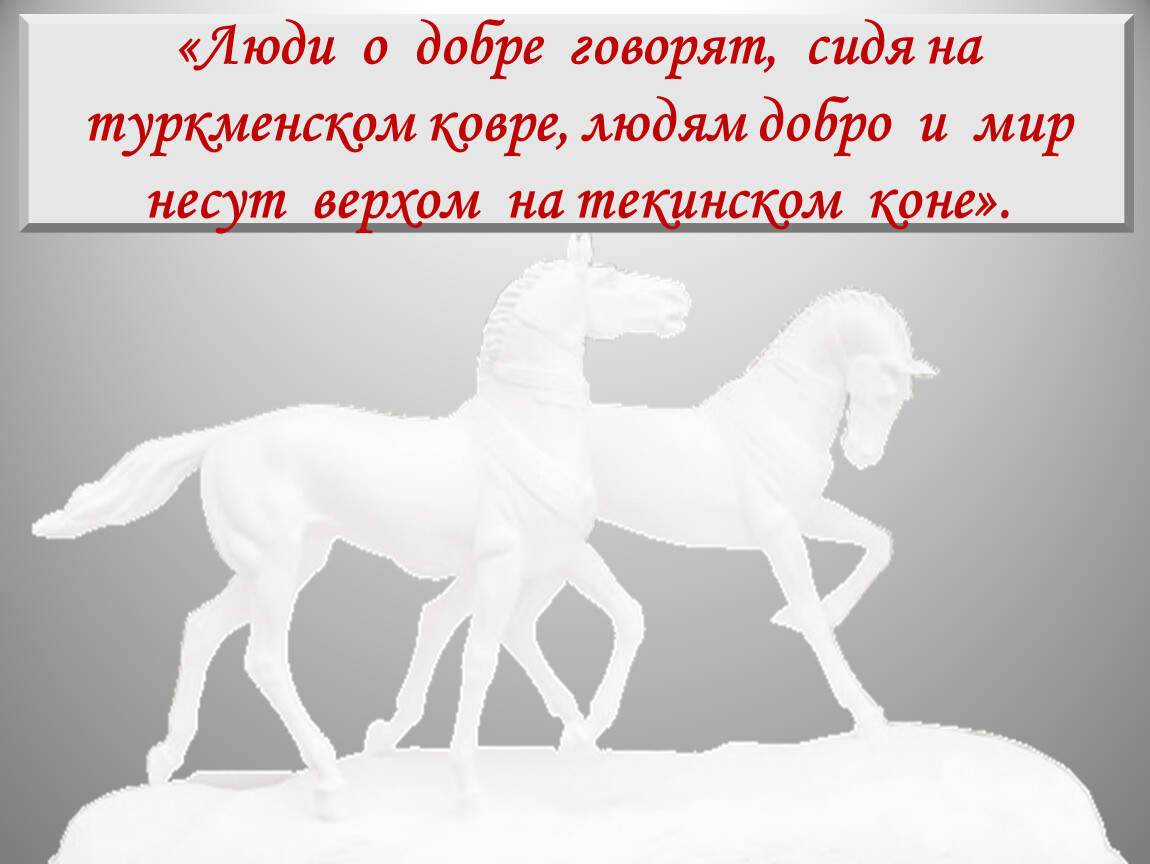 «Люди о добре говорят, сидя на туркменском ковре, людям добро и мир несут верхом на текинском коне».