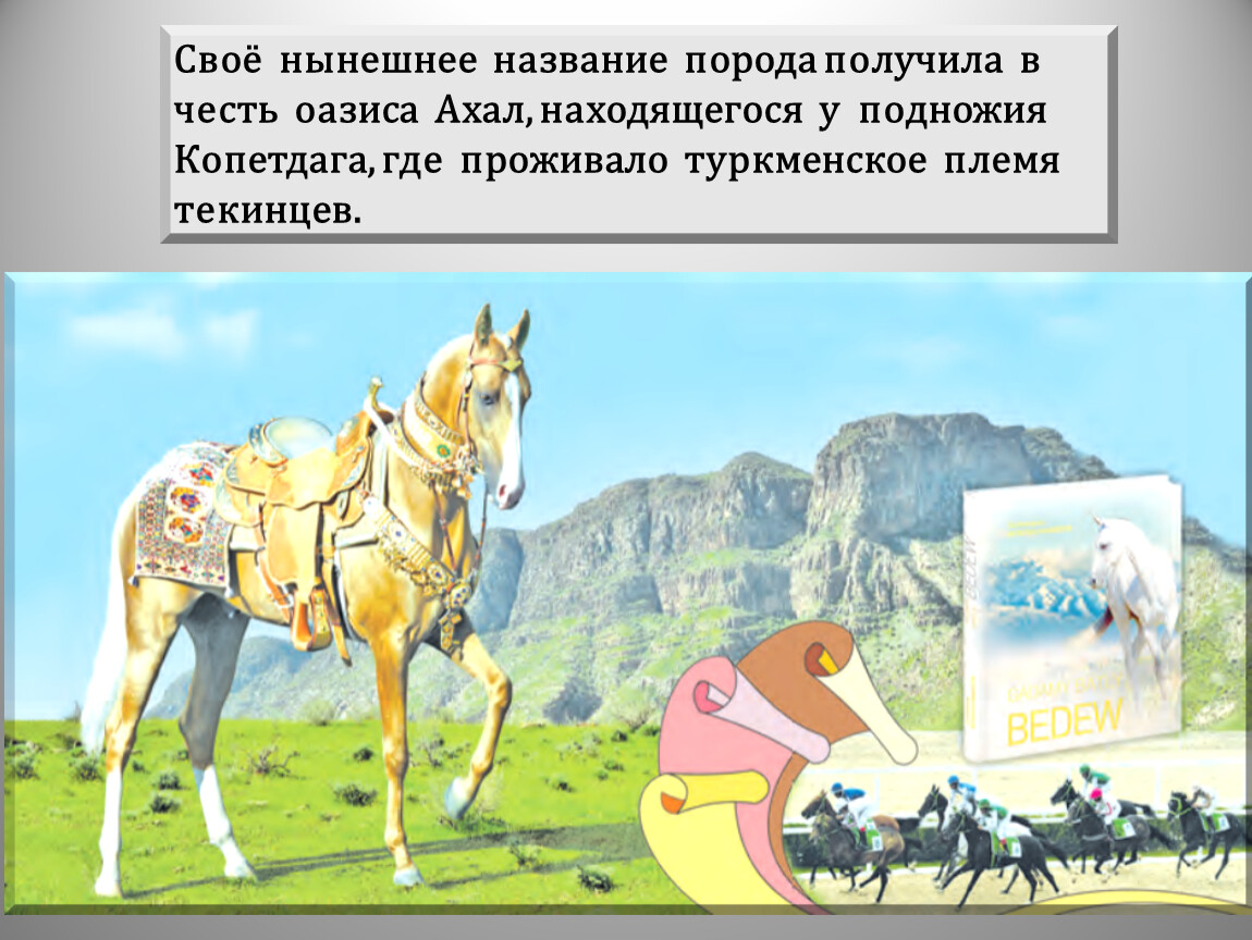 С тех пор и дают ахалтекинским скакуном имена птиц Мелекуш, Каракуш, Дурна́, Бе́ркут.