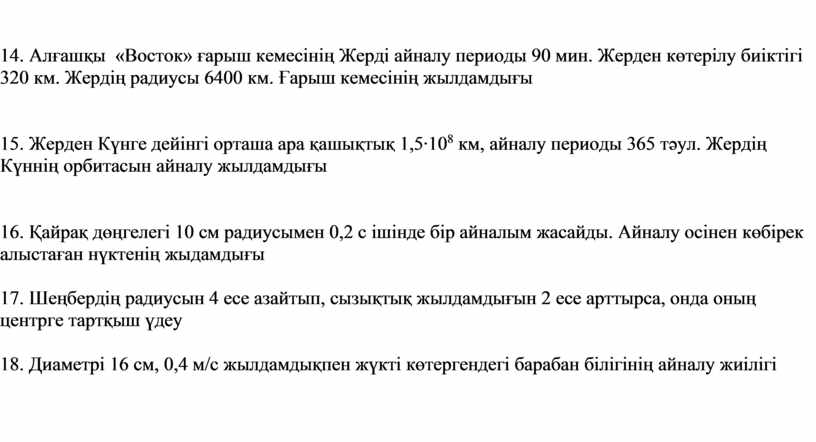 14. Алғашқы «Восток» ғарыш кемесінің Жерді айналу периоды 90 мин. Жерден көтерілу биіктігі 320 км. Жердің радиусы 6400 км. Ғарыш кемесінің жылдамдығы