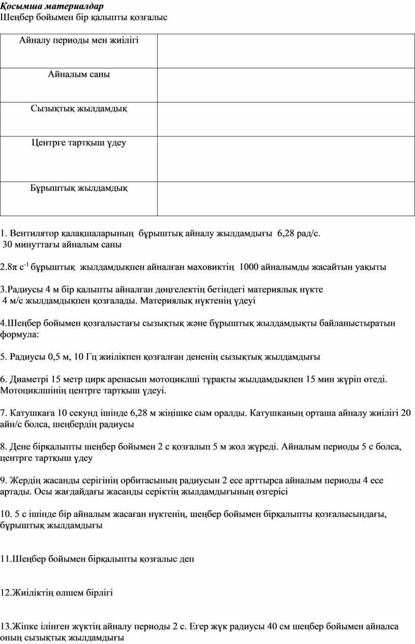 6. Диаметрі 15 метр цирк аренасын мотоциклші тұрақты жылдамдықпен 15 мин жүріп өтеді. Мотоциклшінің центрге тартқыш үдеуі.