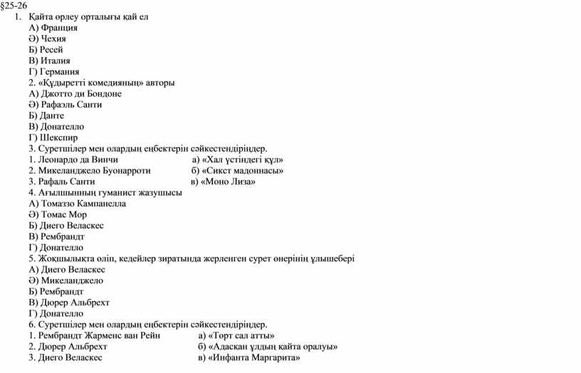 1. «Қайта өрлеу» дәуірі неліктен Италияда дамыды? 2. Қайта өрлеу дәуірі ұлы суретшілерінің еңбектері неліктен қазіргі күнге дейін құнды деп ойлайсыңдар? 3. Италиядағы қайта өрлеу дәуірінің өнері қандай еуропалық елдердің суретшілеріне ықпалын тигізді, мысалдар келтір. |