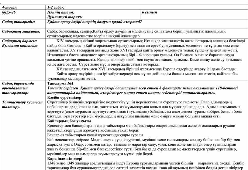 Тапсырма №1 Төменде берілген Қайта өрлеу дәуірі басталуына әсер еткен 8 факторды және оқулықтың 118-беттегі ақпараттарды пайдаланып, өзгерістерге ықпал еткен нақты себептерді топтастырамыз. Кәсіби суретшілер Суретшілер бейненің тереңдігіне қолжеткізу үшін перспективалы суреттеуге тырысты. Олар адамдардың нобайларын дәлдікпен салып, жаттығып өз жұмыстарына алдын-ала мұқият дайындалды. Адам анатомиясын зерттеуге (адам мүрдесін зерттеуге мүмкіндігі туындаған) байланысты адам денесі туралы көбірек белгілі бола бастады. Бұл суреттер мен мүсіндердің неғұрлым шынайы және өмірге жақын болуына ықпал етті. Байлардың бос уақыты Көпестер мен банкирлердің жаңа табыстары мен байлықтары оларға демалысқа және өз ақшаларын рухани қажеттіліктері үшін жұмсауға қосымша уақыт берді. Байлар өз табыстарын қалай жұмсағандықтары туралы Бай меценаттар, әсіресе Медичилер ең үздік суретші, мүсінші және ғалымдарды жалдау бойынша бір-бірімен жарысқа түсті. Олар, сонымен қатар, тамаша ғимараттар салу, үздік көне және заманауи өнер туындаларын жинау бойынша бір-бірімен бәсекелестікке түсті. Бұл басқа да еуропалық мемлекеттерден үздік суретшілер, мүсіншілер мен ғалымдарды жұмылдыруға мүмкіндік берді. Қара індеттің әсері 1348 және 1349 жылдар аралығындағы індет Еуропа тұрғындарының үштен бірінің қырылуына әкелді. Кейбір тарихшылар бұл еуропалықтардың сол сәттегі ләззәттің қамын ғана ойлауының кесірінен болды деген пікірлер айтады. Бай италияндықтар өз қаржыларын көбінесе христиандыққа емес, өздеріне жұмсауға ғана дайын болған. Италиялық қала-мемлекеттер-«Жаңа Рим». XV ғасырдағы көптеген қала-мемлекеттер республикалар болды (халық атынан билік жүргізген үкіметтер), ол кезде тіпті бір ауқатты отбасы шынымен билік жүргізе алды. Патшалар болмады, дворяндар билігі банкирлер мен көпестердің өсіп келе жатқан байлығымен шектеліп, тежелді. Бұндай қалалар өздерін «Жаңа Рим» деп атады. Өздеріне ежелгі грек және Рим империясының білімін, билігін, атағын, байлығын, мәдениетін ашты. Шіркеу және гуманизм Римдік католик шіркеуінің штаб-пәтері Римде орналасты. Папа мен кардиналдардың (жоғары шіркеу шендері) билігі мен байлығы үздік суретшілер, мүсіншілер және ғалымдар іске тартылды және жақсы жалақы алды дегенді білдірді. Кейбір итальяндықтар (шіркеу қызметкерлері) дінге деген көзқарастардан және гуманизмнің таралуынан әсер алды. Әлемге байланысты бұндай көзқарастың қалыптасуы адамның денесі Құдайдың бейнесі мен кейпіне сәйкес жасалғанын айтып тұр. Шынайыға жақын, табиғи үлгіде әулие және қарапайым адамдардың бейнесін суреттеу, бейнелеу, мүсіндеу қолайлы болды. Гуманистер ежелгі грек, рим мәтіндерін түпнұсқа түрінде зерттеуді қалады. Мысалы, Библия немесе грек пьесалары. Ежелгі және жаңа білімге құштарлық 1396 жылы Италия қаласы Флоренция византиялық ғалым Мануил Хрисолорды университетте дәріс оқуға шақырды. Ол (және оған ұқсас гректер) Батыс Еуропада ғасырлар аралығында жоғалған (немесе ескерілмеген) ежелгі грек және рим мәтіндері туралы білімдерді таратты. Бұл Италияда адамдардың үнемі ежелгі және жаңа білімге құштарлығының бар болғанын білдірді. Байлардың дәулеті XV ғасырда итальян қалалары сауда мен банк істерінің маңызды орталықтарына айналды. Бұл байлардың орасан зор ақшаға ие болғандығын және оларды жұмсай алғандығын білдіреді. Бас