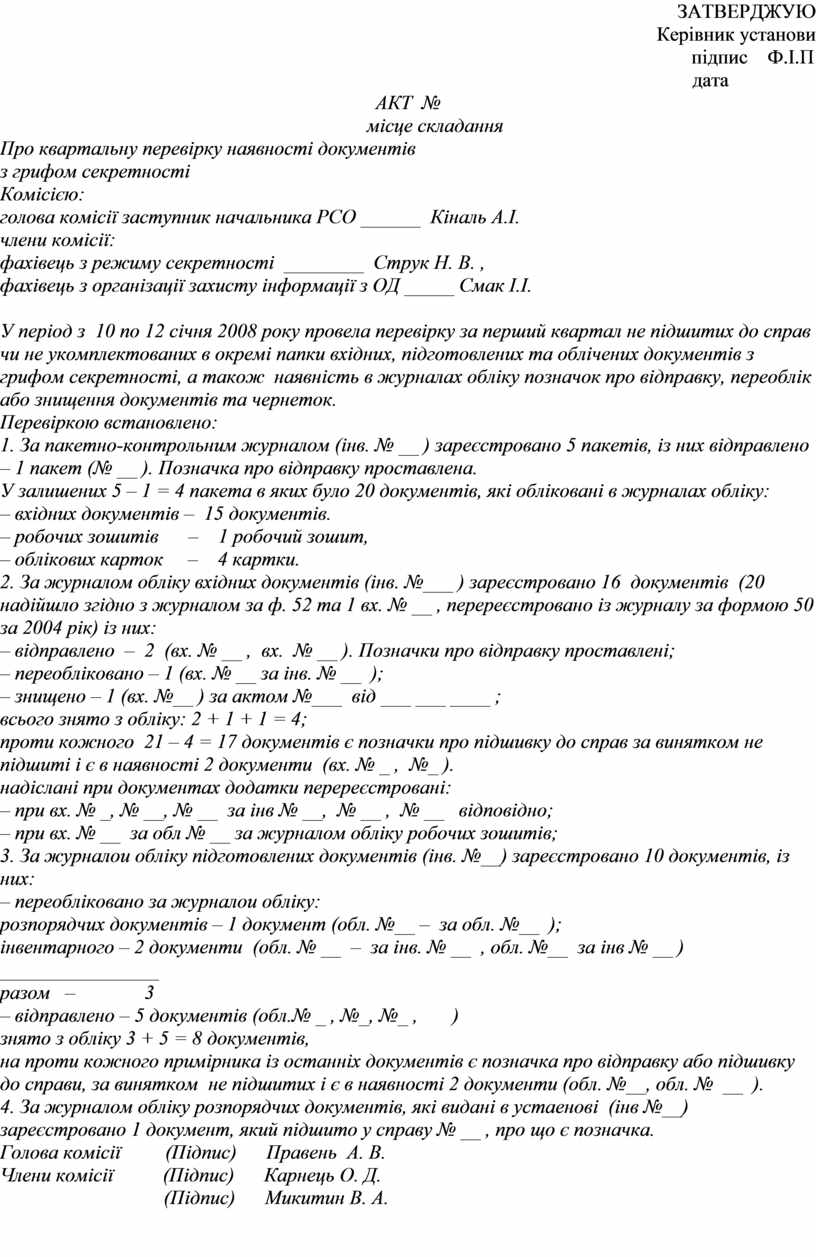 У період з 10 по 12 січня 2008 року провела перевірку за перший квартал не підшитих до справ чи не укомплектованих в окремі папки вхідних, підготовлених та облічених документів з грифом секретності, а також наявність в журналах обліку позначок про відправку, переоблік або знищення документів та чернеток.