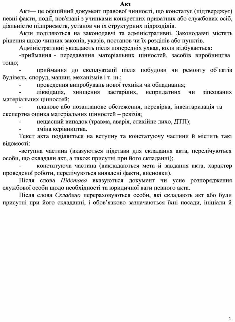 Акт— це офіційний документ правової чинності, що констатує (підтверджує) певні факти, події, пов'язані з учинками конкретних приватних або службових осіб, діяльністю підприємств, установ чи їх структурних підрозділів.