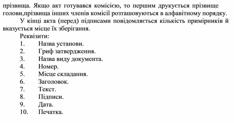 прізвища. Якщо акт готувався комісією, то першим друкується прізвище голови, прізвища інших членів комісії розташовуються в алфавітному порядку.