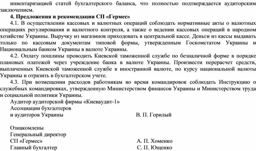Аудиторская проверка бухгалтерского учета финансово-хозяйственной деятельности СП «Гермес» за период с 1 января 199 _ г. по 31 декабря 199 _ г. позволяет сделать вывод, что состояние бухгалтерского учета соответствует законодательству и нормативно-правовым актам Украины. В бухгалтерском учете своевременно в полном объеме и правильно отражено финансово-хозяйственная деятельность СП «Гермес» за проверенный период. Внеуставной деятельности не выявлено. Вместе с тем аудитом выявлено нарушение нормативных актов при осуществлении валютных операций и компенсации расходов работникам за период командировок.