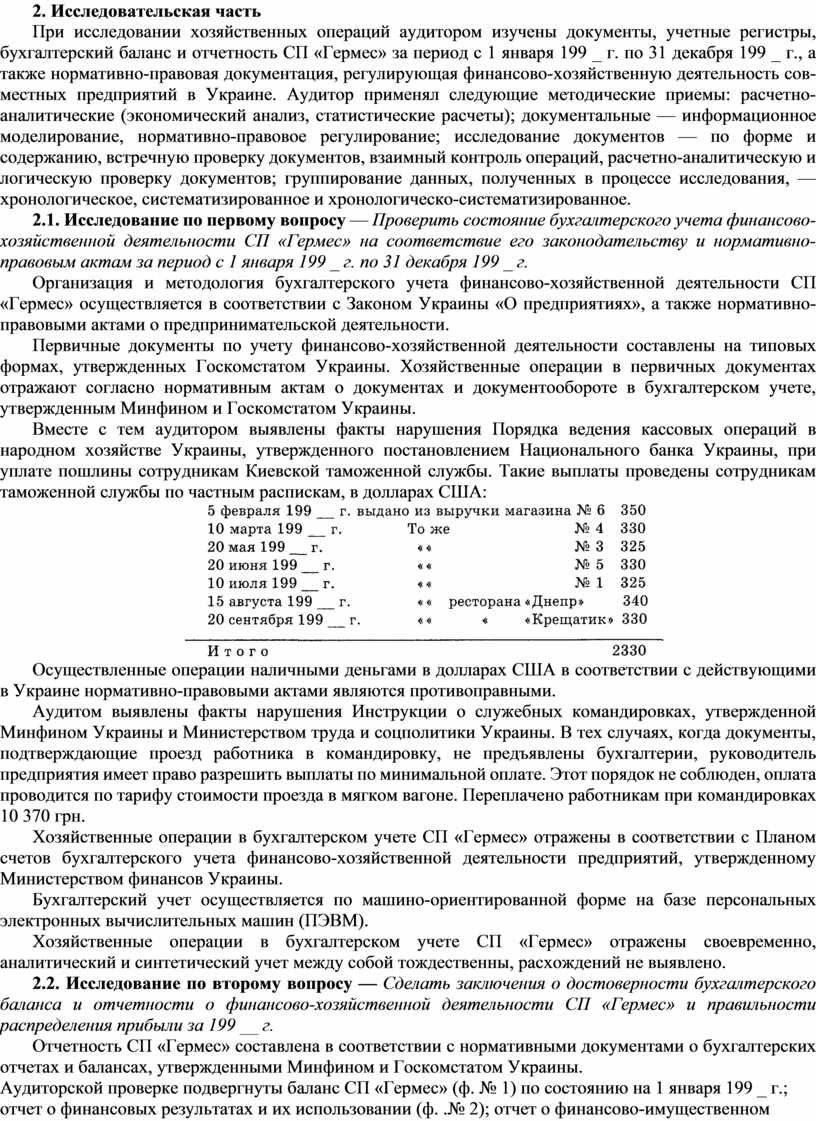 2.1. Исследование по первому вопросу — Проверить состояние бухгалтерского учета финансово-хозяйственной деятельности СП «Гермес» на соответствие его законодательству и нормативно-правовым актам за период с 1 января 199 _ г. по 31 декабря 199 _ г.