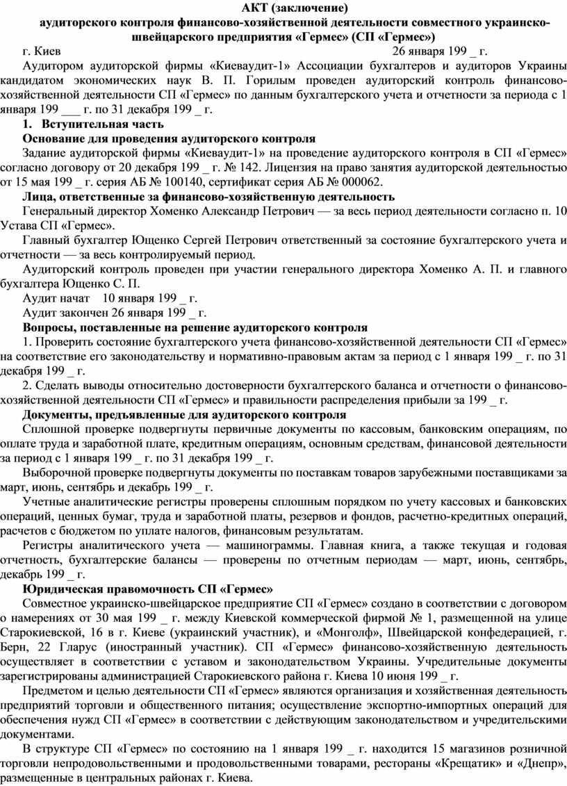 Аудитором аудиторской фирмы «Киеваудит-1» Ассоциации бухгалтеров и аудиторов Украины кандидатом экономических наук В. П. Горилым проведен аудиторский контроль финансово-хозяйственной деятельности СП «Гермес» по данным бухгалтерского учета и отчетности за периода с 1 января 199 ___ г. по 31 декабря 199 _ г.