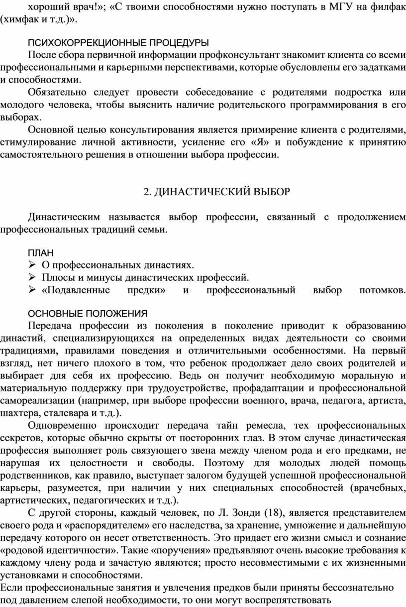 Наш подход к профессиональному выбору на первый взгляд парадоксален, так как соединяет положения теории черт и факторов Ф. Парсона, теорию развития (Е. Гинцберг, Д. Сьюпер) с концепциями судьбоанализа Л. Сонди и М. Ахтниха, т.е. глубинной психологией. Но как в человеке тесно переплетено рациональное с иррациональным, а разум успешно сотрудничает с интуицией, так и в практике профконсультирования, на наш взгляд, возможен синтез и использование разных подходов.