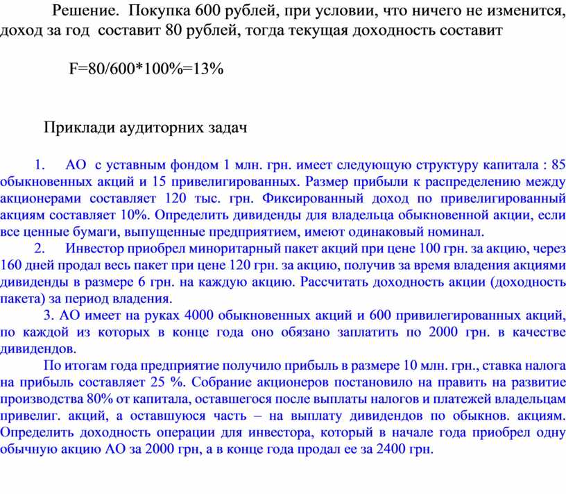 Решение. Покупка 600 рублей, при условии, что ничего не изменится, доход за год составит 80 рублей, тогда текущая доходность составит