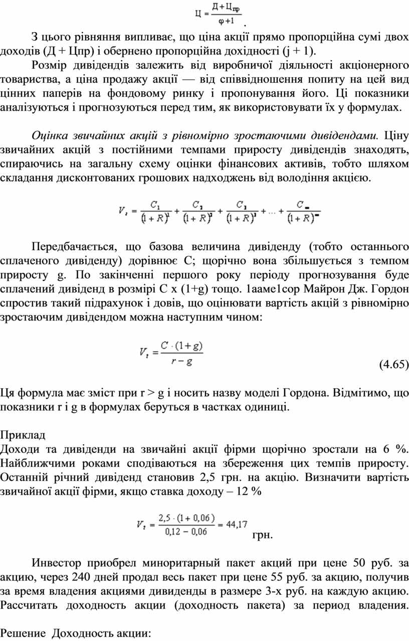 Передбачається, що базова величина дивіденду (тобто останнього сплаченого дивіденду) дорівнює С; щорічно вона збільшується з темпом приросту g. По закінченні першого року періоду прогнозування буде сплачений дивіденд в розмірі C x (1+g) тощо. аамесор Майрон Дж. Гордон спростив такий підрахунок і довів, що оцінювати вартість акцій з рівномірно зростаючим дивідендом можна наступним чином: