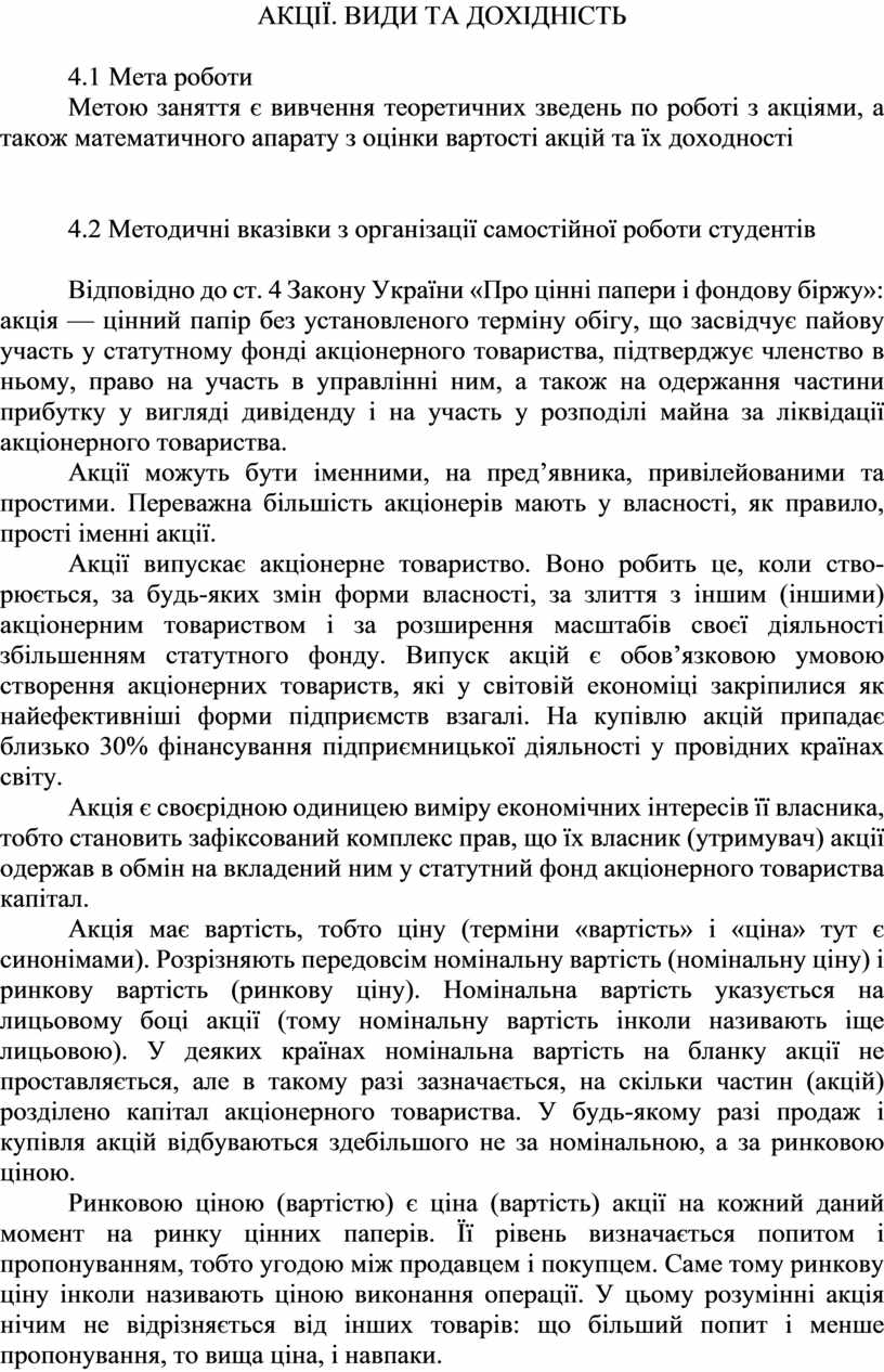 Метою заняття є вивчення теоретичних зведень по роботі з акціями, а також математичного апарату з оцінки вартості акцій та їх доходності