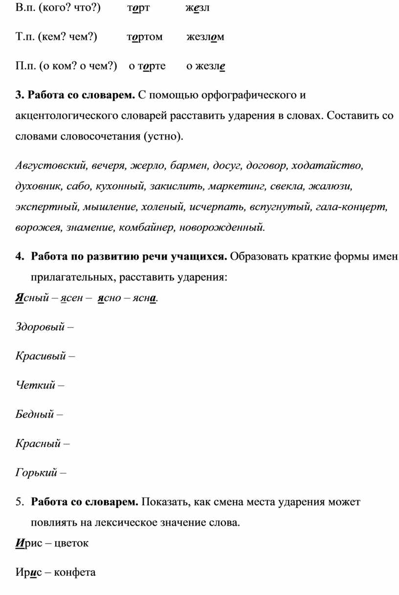 4. Работа по развитию речи учащихся. Образовать краткие формы имен прилагательных, расставить ударения: