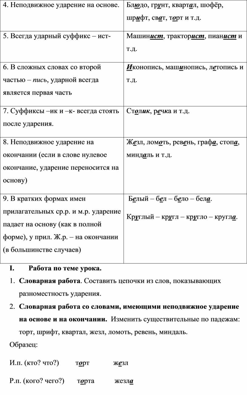 2. Словарная работа со словами, имеющими неподвижное ударение на основе и на окончании. Изменить существительные по падежам: торт, шрифт, квартал, жезл, ломоть, ревень, миндаль.